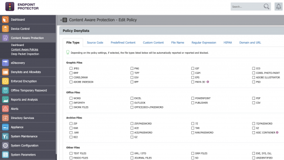 - Content Aware Protection allows Administrators to set up and enforce strong content filtering policies for selected users, computers, groups, or departments and take control over the risks posed by accidental or intentional file transfers of sensitive company data.