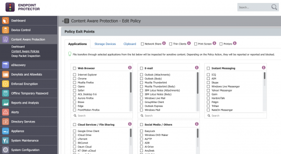 Content Aware Protection (CAP) is one of Endpoint Protector’s key modules. As data is moved from the employee endpoint to cloud applications and USB drives or through email and enterprise messaging applications, CAP inspects the content to ensure it doesn’t breach your data protection policies. For example, you may want to restrict employees from sharing customer PII via email or being able to upload it to cloud storage services. CAP can also prevent transfers via copy and paste and print screens.