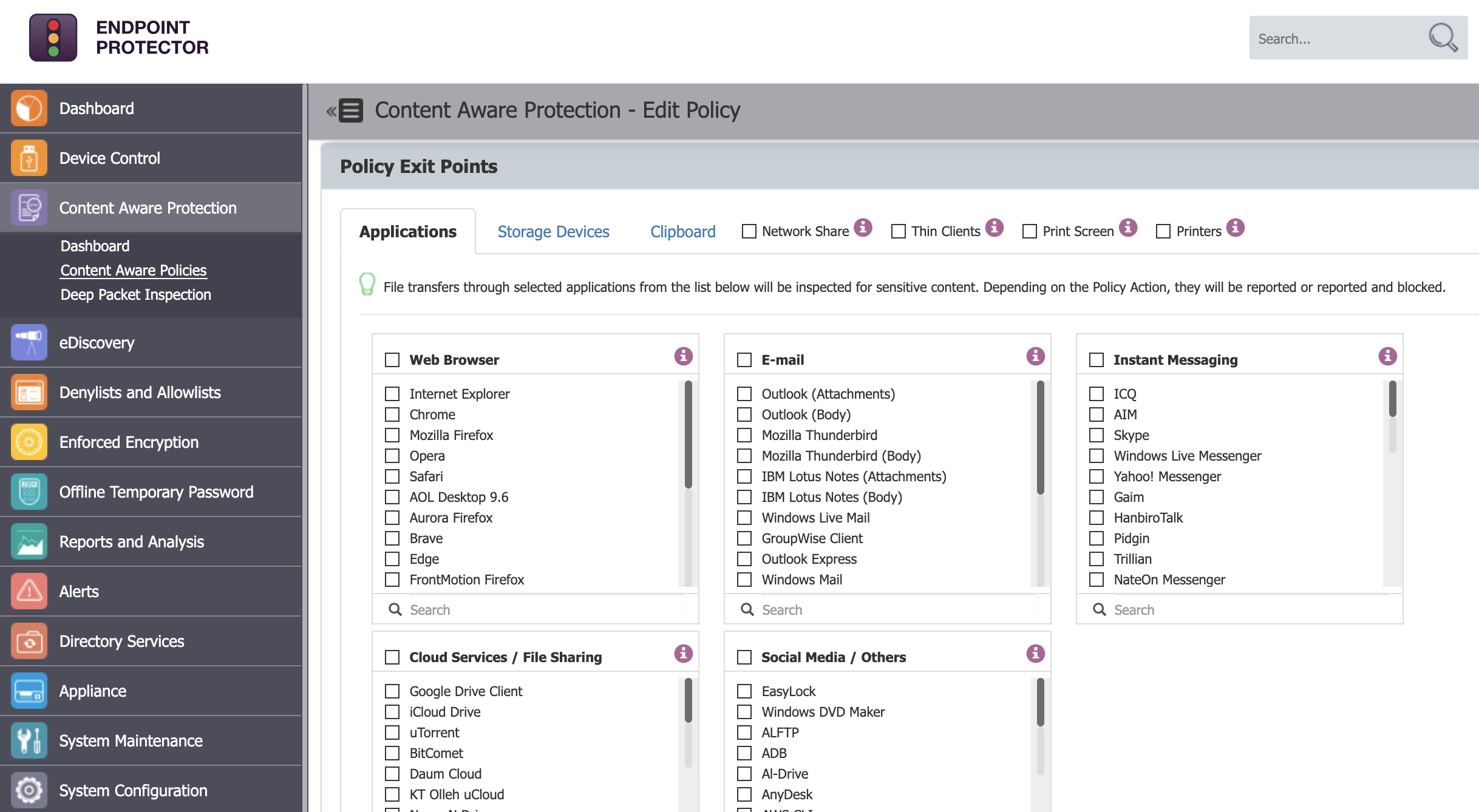 The Applications tab under ‘Exit Points’ is commonly used for common email clients and/or web browsers in a given environment. It also allows you to monitor enterprise messaging apps and file-sharing services. Alongside this, the Storage Devices tab can be used if you intend to later restrict the transfer of sensitive files to storage media.